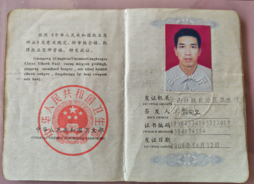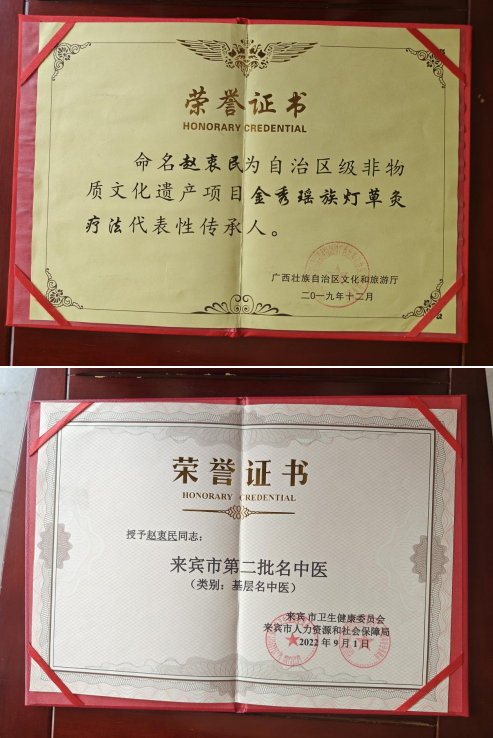 2006年考取广西省个体医师中医执业医师资格证书;2009年考取中华人民共和国中医执业资格证书;2017年荣获全国第一批优秀民间瑶医称号;
