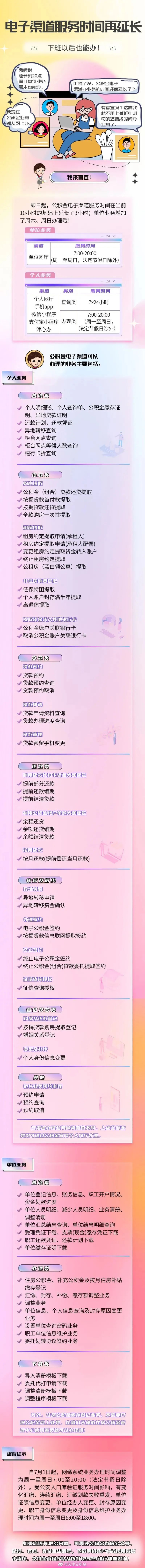 公积金电子渠道服务时间延长3小时,调整为每日7:00-20:00,同时单位业务增加周六日办理。