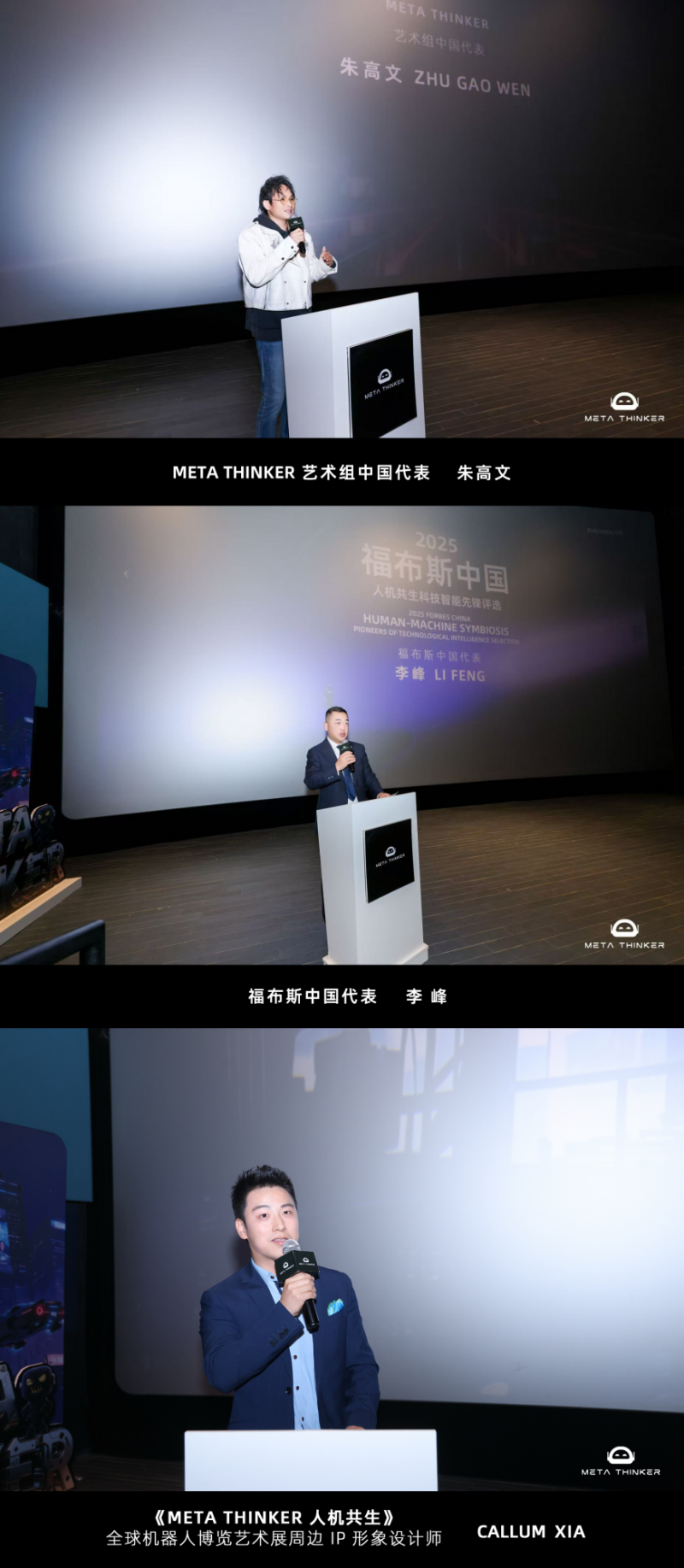 《META THINKER》艺术组中国代表朱高文则从艺术视角出发,称科技为艺术提供了新载体,能消解公众对科技的距离感;媒体支持方福布斯中国代表李峰介绍了人机共生科技智能先锋评选;周边产品卡鲁鲁IP设计师Callum Xia分享了周边的设计理念。