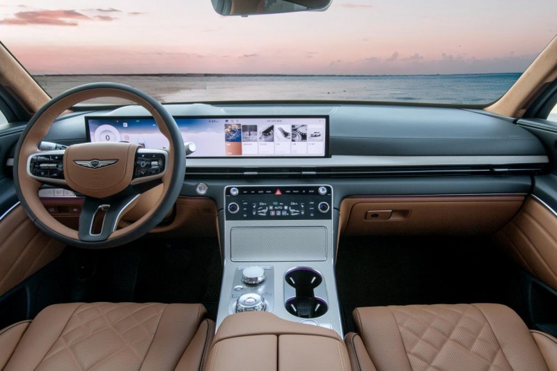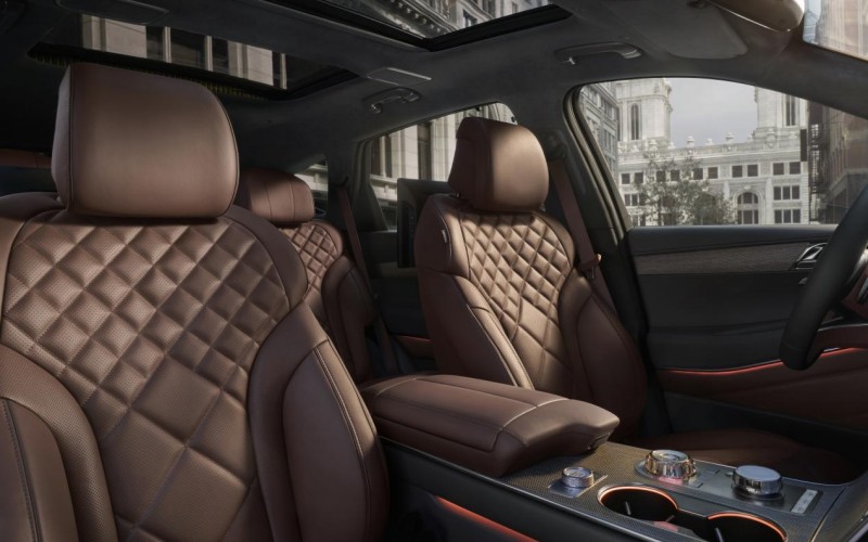 NAPPA真皮座椅更是内饰工艺的集大成者,甄选头层NAPPA真皮,经过无涂层的精细处理,保留皮革最原始的柔软与细腻,座椅表面以标志性的菱格绗缝图案呈现,绗缝的走线间距精准、针脚细密,不仅让座椅视觉上更具层次感与高级感,更能提升座椅的包裹性与舒适度,久坐也无疲惫之感。车内的水晶电子换挡旋钮与Genesis集成控制器,采用宝石质感的切割与打磨工艺,通透的水晶材质搭配精致的金属边框,指尖转动时阻尼感适中、手感顺滑,操作的同时更能成为内饰的精致摆件,将实用功能与美学设计完美融合。