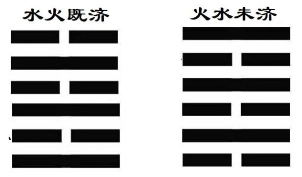以水火既济卦与火水未济卦为例,可以具体说明上述规则。既济卦(离下坎上)的爻位配置为:初阳、二阴、三阳、四阴、五阳、上阴。其中,阳爻居初、三、五阳位,阴爻居二、四、上阴位,六爻皆得位;二与五皆得中;初与四、二与五、三与六阴阳相应,构成“六爻皆应”的理想状态。未济卦(坎下离上)的爻位配置为:初阴、二阳、三阴、四阳、五阴、上阳。其中,阴爻居初、三阳位,阳爻居二、四、上阴位,六爻皆不得位,但初与四、二与五、三与六仍然阴阳相应。两卦一正一反,既济象征事物之已成,未济象征事物之未成,体现了易学对事物发展过程中完成与未完成两种状态的深刻认识。